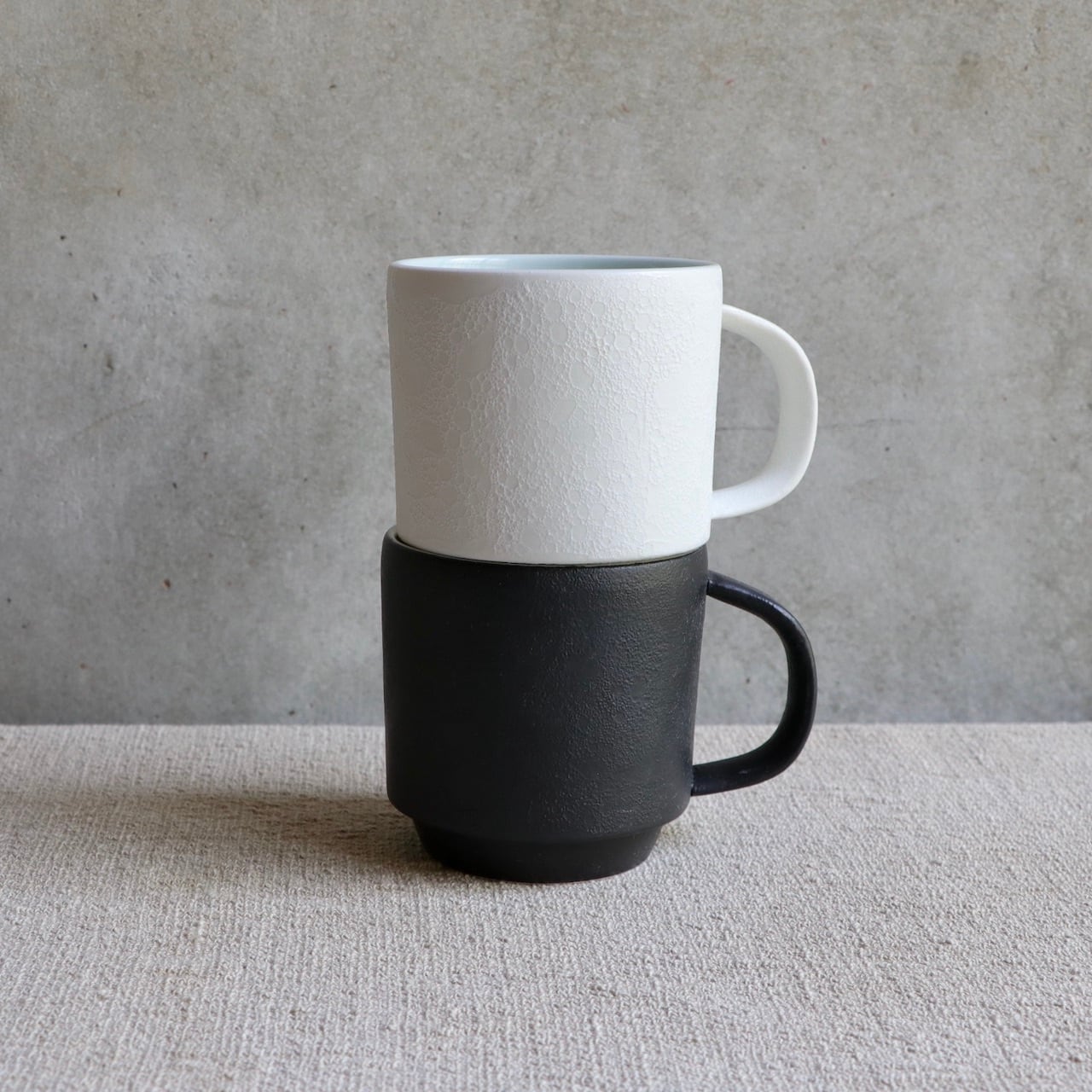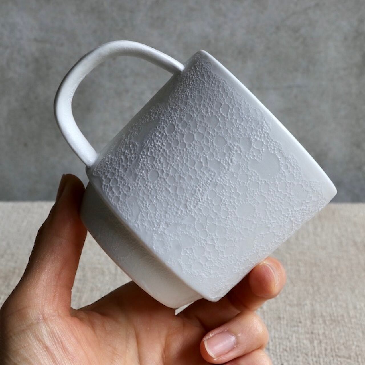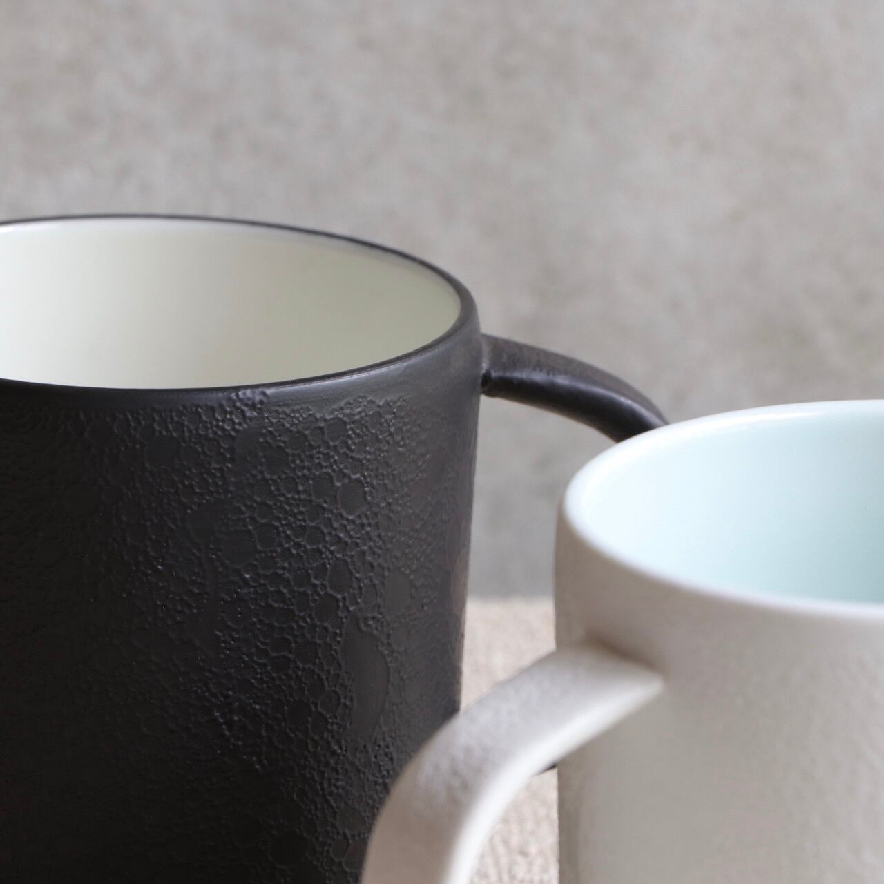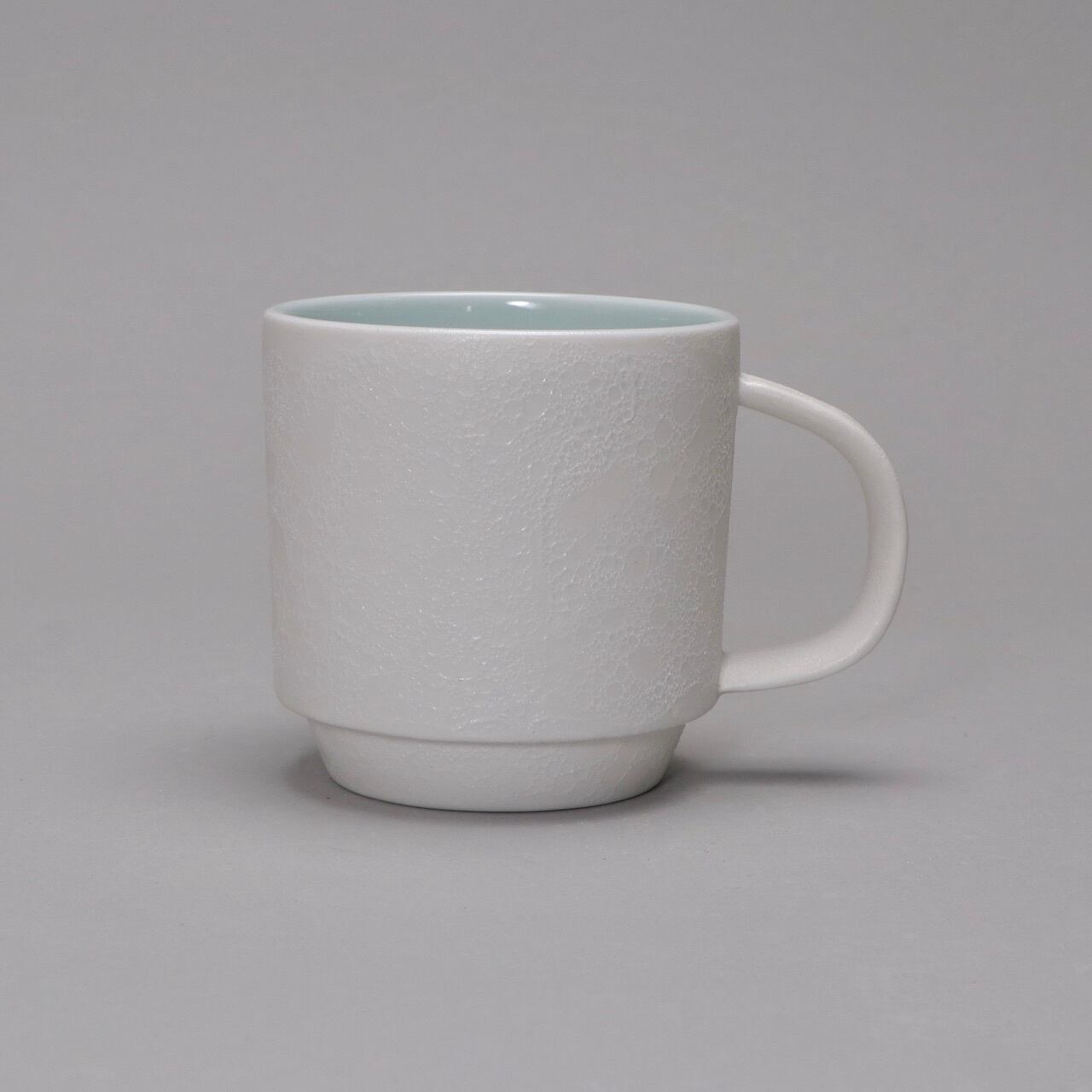 外側が白い泡の表情で内側が青磁釉のマグカップです。